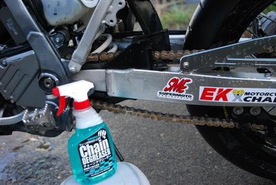 ・・で、チェーンも、オイルと土の汚れで固まってしまっていたので、最近オフ車用に買ったチェーン用洗剤で洗ってみました。