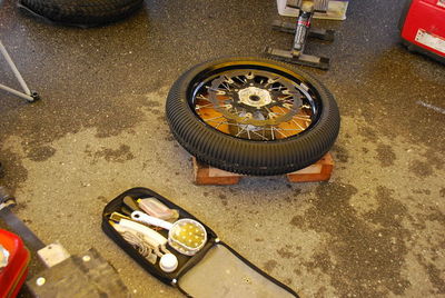 中古のフロントのレインタイヤ、履かせ換えるのはあっという間。